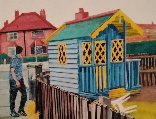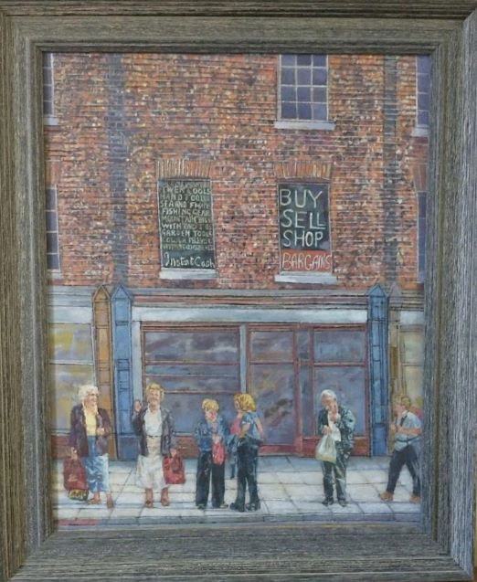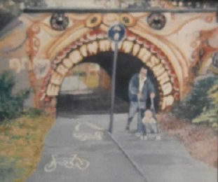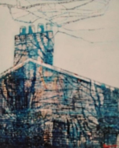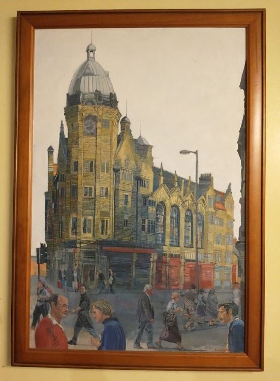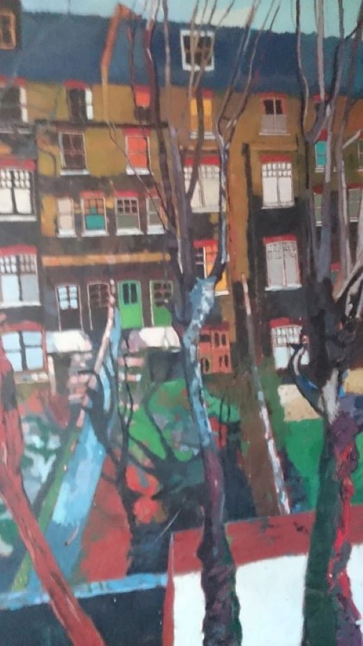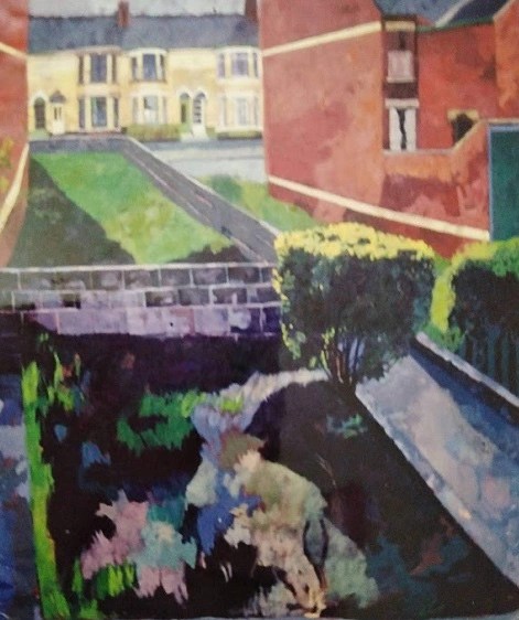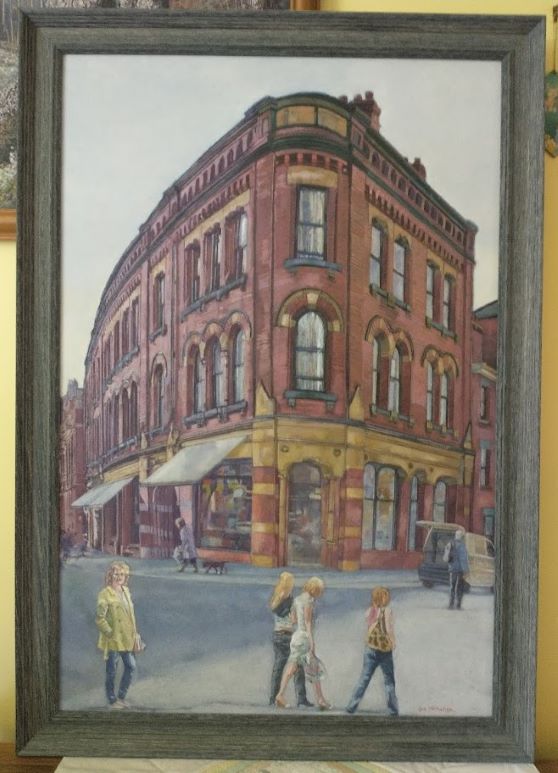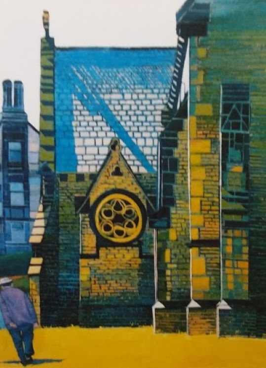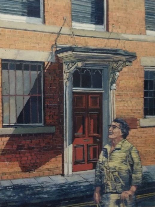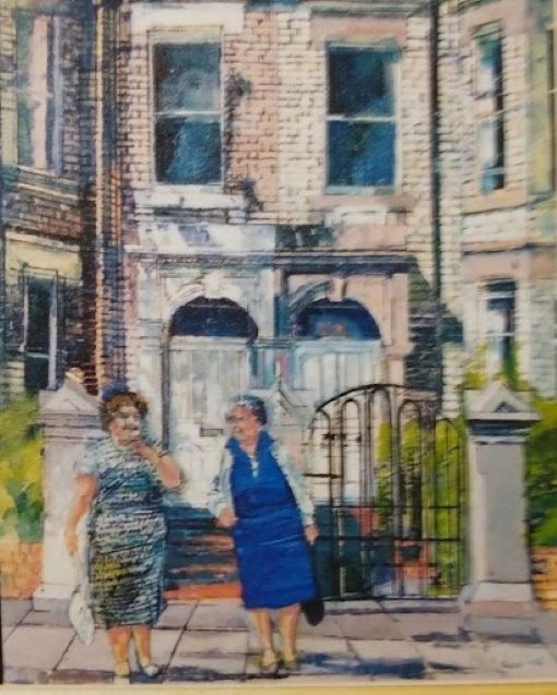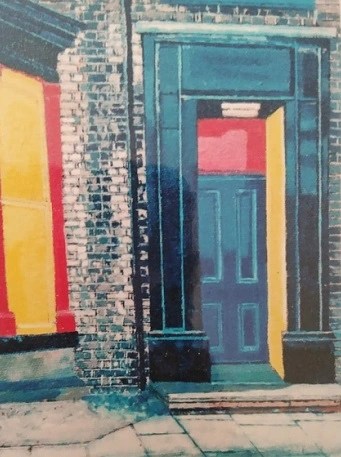 With increased experience of seeing many more different types of buildings, my passion increased to painting and drawing architecture. For many years I concentrated on a solitary building, or a small view, but after being in Newcastle people began to inhabit my streets. This shy person had found a sense of Community. I worked from brick terraced houses to a Georgian doorway, an Afro Caribbean brightly coloured Center, looking down into tall London houses with their gardens and trees. The trees softened the silhouette of the buildings with their fleeting shadows and organic shapes. The shadows created an atmosphere, and I had a sense of the inter-relatedness of all.